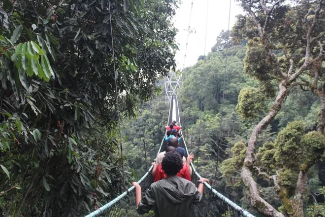 At Uwinka Reception Centre, there was a bit of nervous energy in our group before the canopy walk. The staff gave us a quick safety talk and handed out walking sticks (I’d recommend grabbing one if it rained recently—the trail gets slippery). Once we started along the Igishigishigi trail, you could hear birds everywhere—some calls were sharp, others almost musical. Then came the main event: stepping onto that suspended bridge, 70 meters above the forest floor. My heart thumped as I looked down at layers of green stretching out below. You can spot monkeys darting through the branches if you’re lucky; we saw a flash of black fur—maybe a L’Hoest’s monkey? The whole walk took about two hours but honestly, time felt strange up there.