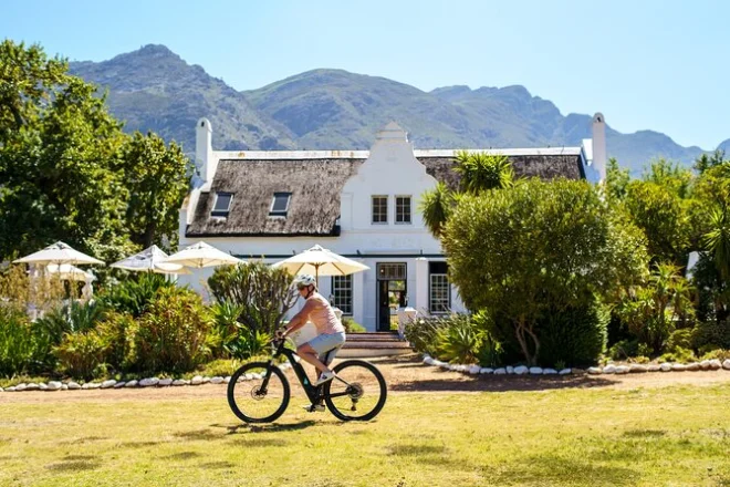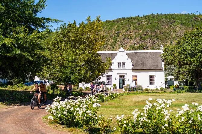 Your spot covers e-bike and helmet rental, all guided wine tastings (four estates), bottled water and snacks along the way, a platter-style lunch at one of the estates, plus a cellar tour—all led by an experienced local guide who knows Franschhoek inside out.