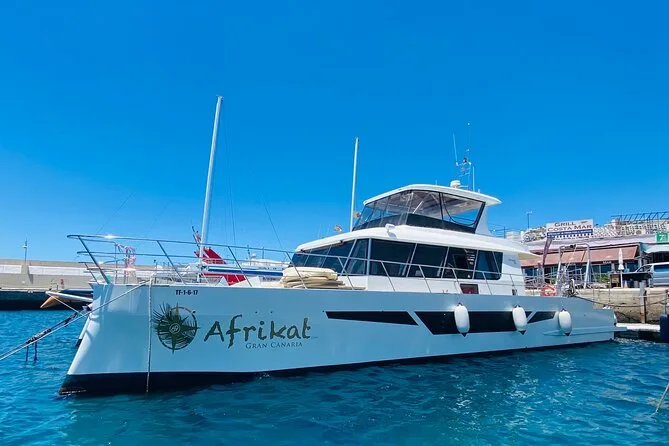 Your day includes return transport from fixed pickup points around Gran Canaria to Puerto Rico’s marina where you’ll board the Afrikat catamaran for 4.5 hours of cruising along the coast—with unlimited drinks like beer or sangria served throughout and a simple lunch of chicken wrap, potato salad and chips after your swim or snorkel stop (equipment provided). Watersports are available at special rates if you want extra adventure before heading back ashore.