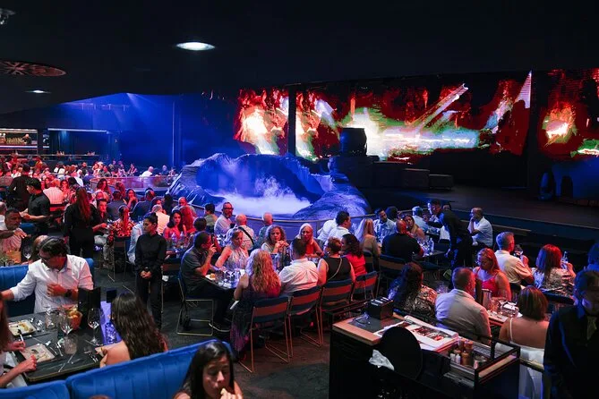 Your evening includes entry to Sala Scala in Gran Canaria for a three-hour Origen dinner show featuring live performances by over 30 artists plus a multi-course tasting menu designed by chef Andrés Rodriguez—all served right at your seat as part of this immersive experience.
