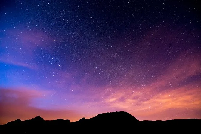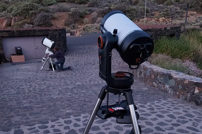 Your day includes pickup from selected south Tenerife locations in an air-conditioned vehicle, a three-course dinner at a local grill restaurant with wine or soft drinks (vegetarian/vegan/gluten-free options available), guidance on taking night sky photos with your phone, use of powerful telescopes and lasers for constellation spotting—and drop-off back to your starting point after stargazing beneath Teide’s skies.
