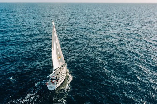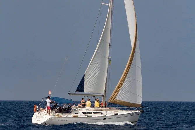 The sailboat accommodates up to 10 passengers plus 2 crew members for an intimate experience.