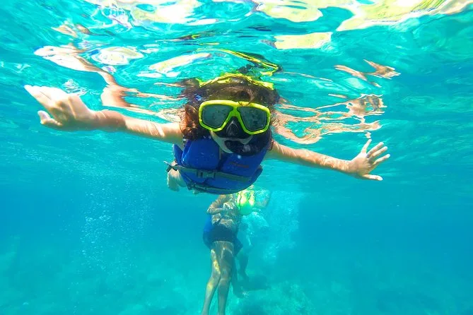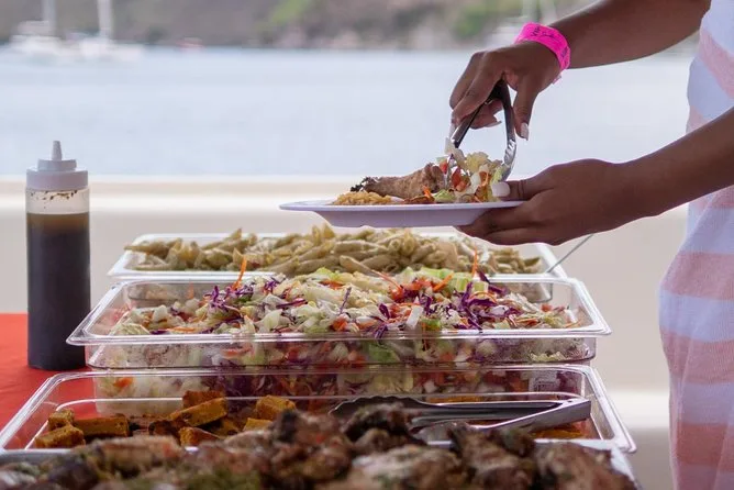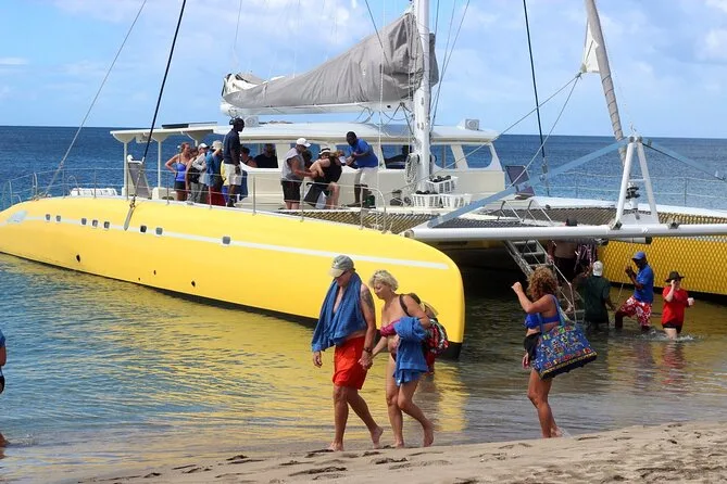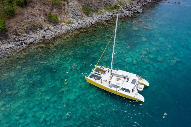 Your day includes port pickup and drop-off at Port Zante Marina in St Kitts, all snorkel equipment for exploring Shitten Bay’s reefs, unlimited drinks from an open bar after swimming (including rum punch), lunch served onboard before your visit to Pinney’s Beach on Nevis—and plenty of easygoing company from both crew and fellow travelers throughout your journey.