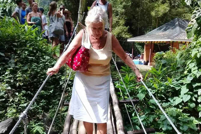 The tour includes uneven paths and a bamboo bridge at Dark View Falls; moderate fitness is needed and it may not be ideal for those with mobility issues.