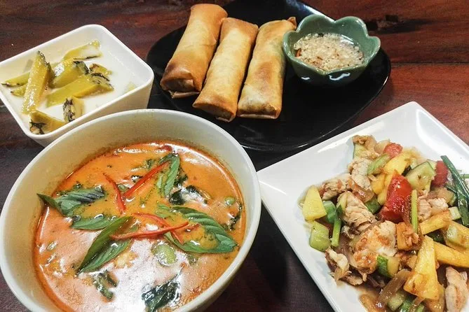 You’ll make four dishes: usually a starter (like coconut soup or papaya salad), one curry (green or red), one main dish (Pad Thai or similar), plus mango sticky rice for dessert.