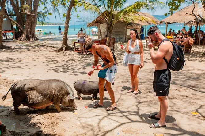 Afterwards we headed over to Pig Island. You can actually smell the sand before you step off the boat — kind of salty and warm, mixed with something sweet from all the fruit people bring for the pigs. The pigs are just… there. Some napping in shady patches, others waddling straight up to us like they owned the place (maybe they do). I fed one a bit of watermelon and it snorted so loudly that everyone started laughing. There’s this funny moment where you realize you’re standing on a white sand beach in Thailand, trying to take a selfie with a pig who’s more interested in your lunch than your camera.