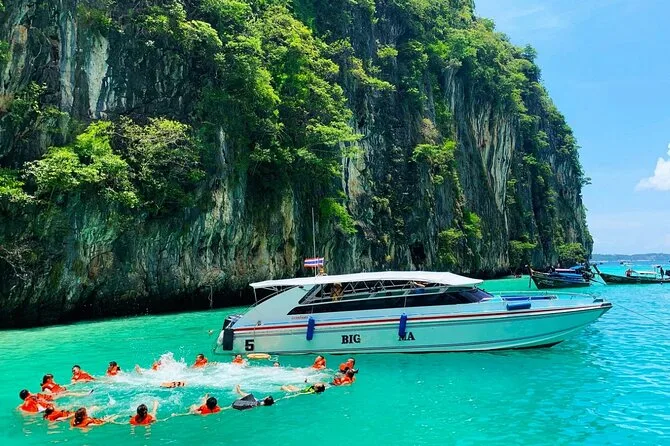 Your day includes hotel pickup in Phuket by minibus, coffee or tea with cookies at the pier before departure, all snorkeling equipment (mask, snorkel, life jacket), soft drinks and fresh fruit onboard throughout the journey, buffet lunch on Phi Phi Don island with time to relax or explore nearby beaches before heading back to your hotel by evening.