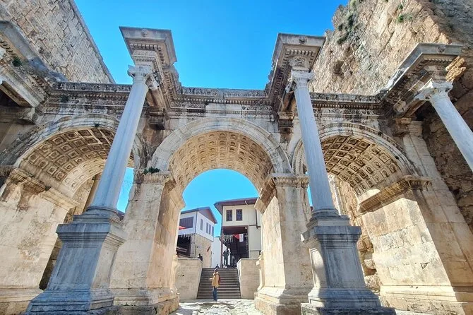 The tour includes Upper Düden Waterfalls, Kaleiçi (Old Town), Hadrian’s Gate, Yivli Minare Mosque, shopping stops for Sultanite jewelry and Turkish Delight, plus an optional boat trip from Antalya Marina.