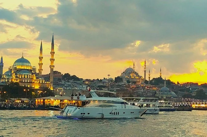 Once on board the yacht (which was fancier than I expected — soft cushions everywhere), people sort of found their own corners. The sun was still high when we passed Ortaköy Mosque — its domes almost glowing against that pale blue sky. Elif told us about the Blue Mosque and Hagia Sophia as we glided past Sultanahmet in the distance; her stories were half history lesson, half gossip (“Sultans had their secrets too,” she winked). At some point they brought out Turkish baklava and tiny cookies on a tray. I took one bite and powdered sugar went everywhere — no regrets though. There was fresh fruit too, which tasted cold and sweet after all that city heat.