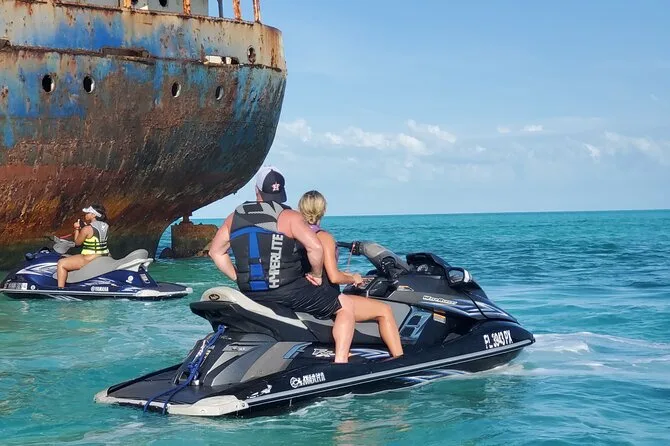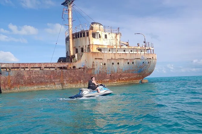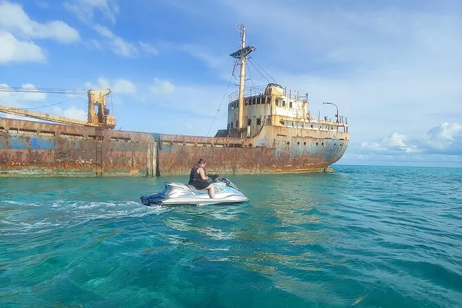 Your day includes use of one jet ski (for one or two people), guidance from experienced local staff throughout the trip, plus stops at both the ghost shipwreck and a quiet private island before returning to shore together.