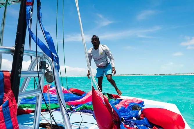 The boat zipped along the coast, picking up two more people at different spots on Grace Bay Beach. There was this moment when we stopped for a minute and everything went quiet except for the slap of waves against the hull. Sun was strong but not brutal; I remember squinting at those impossible shades of blue below us. When it was my turn to go up, Marcus clipped me in and said something about “just enjoy the view.” Honestly? My hands were sweating so much I almost dropped my phone.