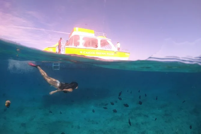 Your afternoon includes hotel pickup and drop-off within Grace Bay, use of all snorkeling equipment so you don’t have to pack extra gear, plus lunch with deli sandwiches and fresh fruit alongside cold drinks like local beer or rum punch—all handled by your friendly local crew before returning you to your hotel later on.