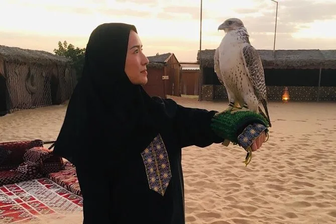 Your tour covers pickup and drop-off in an air-conditioned vehicle, dune bashing with an expert driver, a stop at a scenic viewpoint, camel farm visit plus a short ride, quad biking (optional), sandboarding gear, live belly dance and tanoura shows, henna painting, falcon photo ops in Arabic dress, buffet dinner with water/tea/coffee. Alcohol’s available at extra cost. Wheelchair access and infant seats are provided if needed.