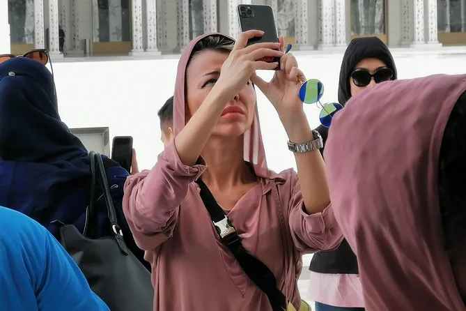 We swung by the Emirates Palace next (you can’t actually go inside unless you’re staying there or have a reservation, which none of us did), but even from outside those golden arches looked unreal against the sky. Ahmed pointed out how many domes there were — 114, apparently — and joked about losing count after twenty. We stopped for photos along the Corniche too; honestly, I didn’t expect Abu Dhabi’s skyline to be so glassy and blue. There was this moment when a breeze came off the water and someone’s headscarf fluttered right into my shot. Made me laugh.