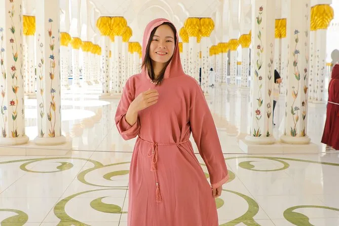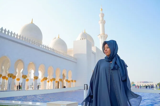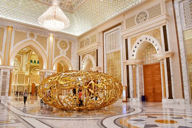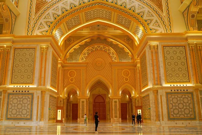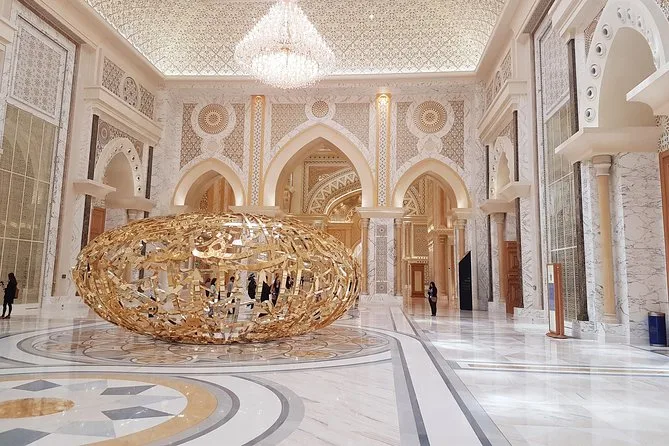 Your day includes hotel pickup and drop-off in Abu Dhabi in an air-conditioned vehicle, entry tickets for Sheikh Zayed Grand Mosque (with abaya and scarf provided for women), access to Etihad Towers’ observation deck for city views, all required fees for Qasr Al Watan Palace, cold mineral water throughout the trip, plus guidance from a licensed bilingual local guide who’ll share stories along the way before returning you back to your hotel or chosen spot.