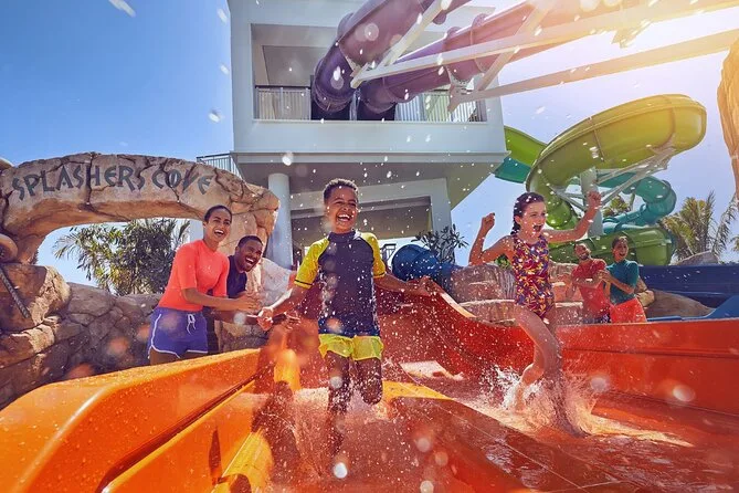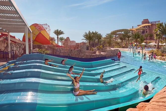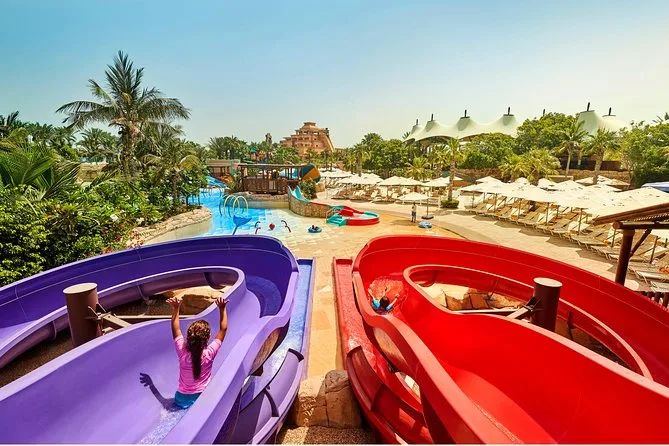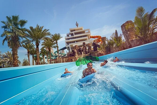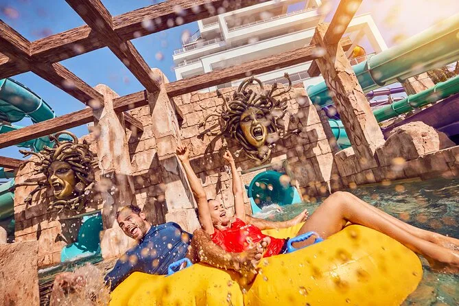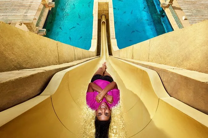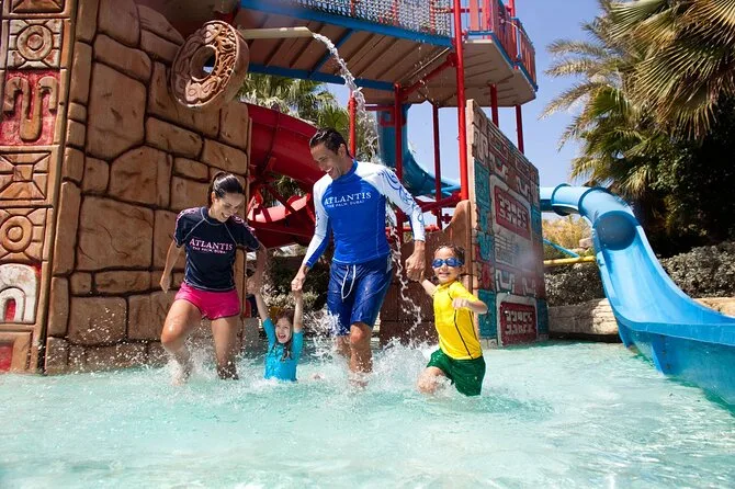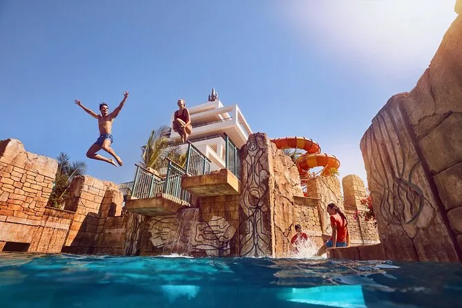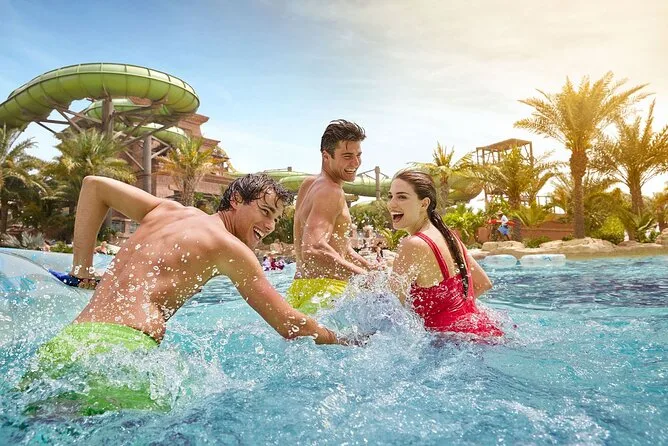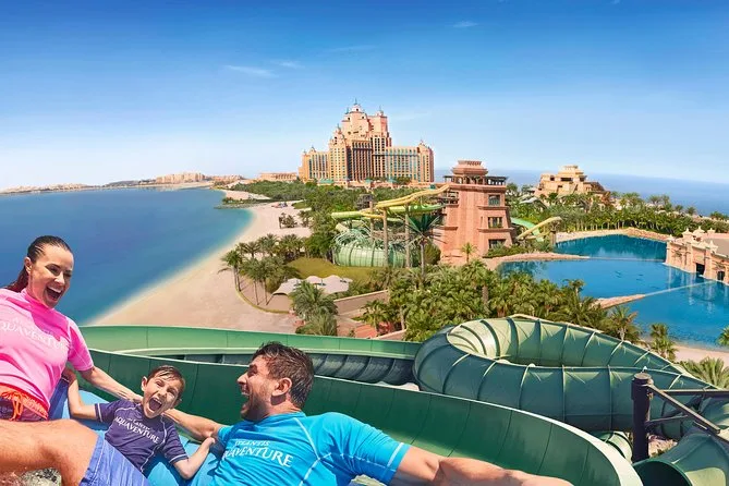 Your day includes entry to Dubai's Aquaventure Waterpark with unlimited access to all slides and attractions—including Surf's Up wave machine—and if you choose the combo ticket, admission to The Lost Chambers Aquarium as well; child life jackets are available inside the park but transportation isn’t included so plan your journey accordingly.