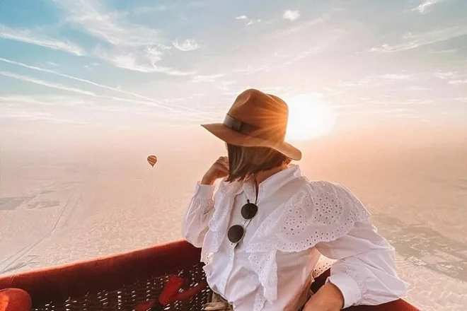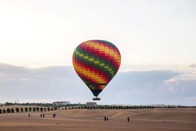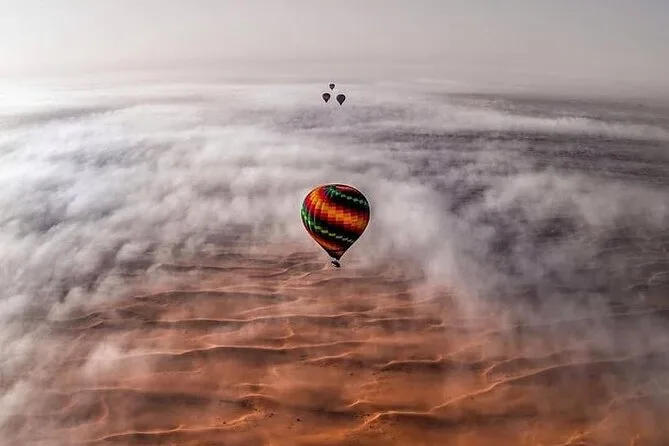 Sunrise balloon flight over Dubai dunes with wildlife and camp breakfast