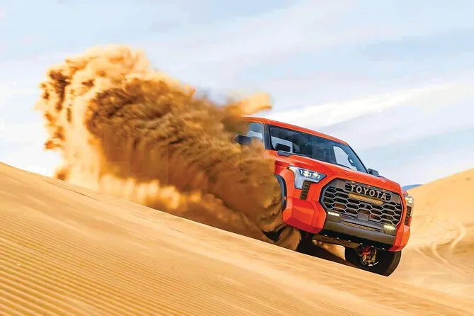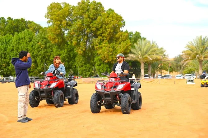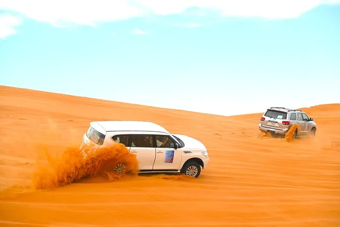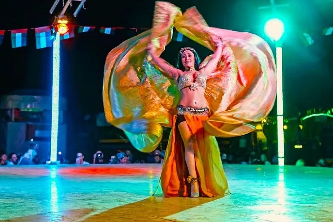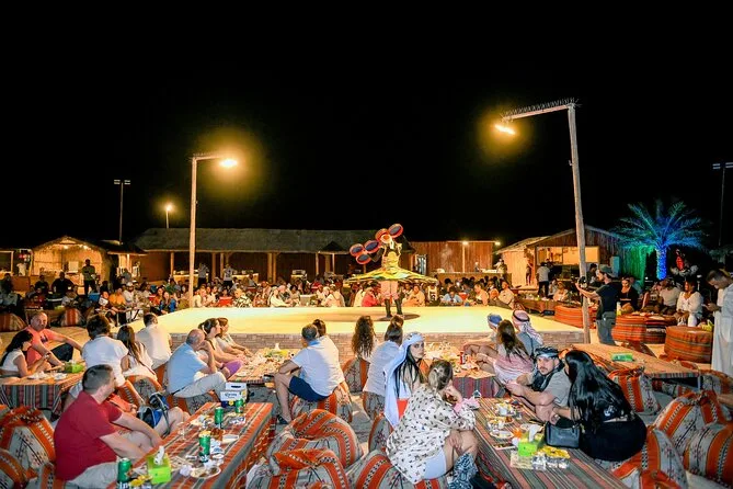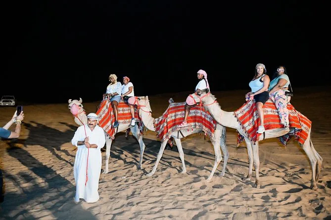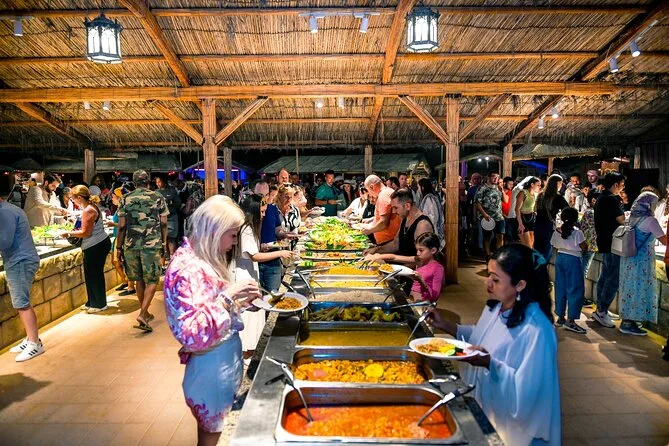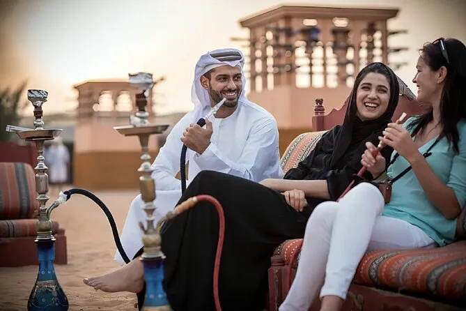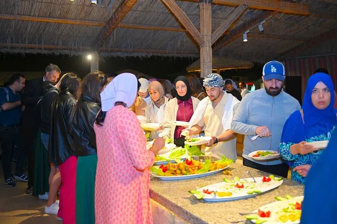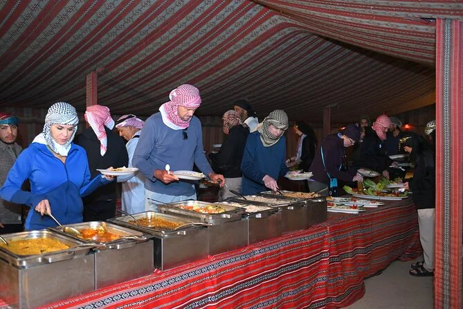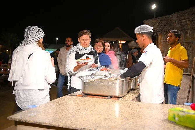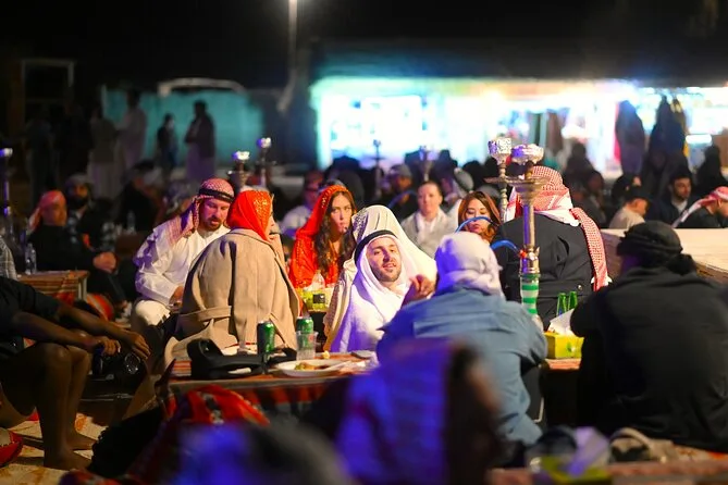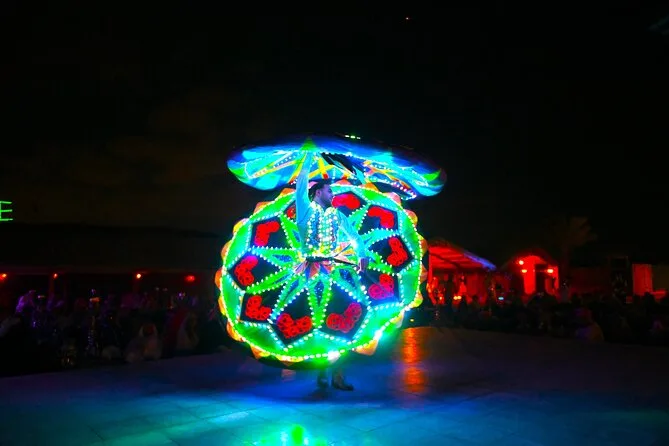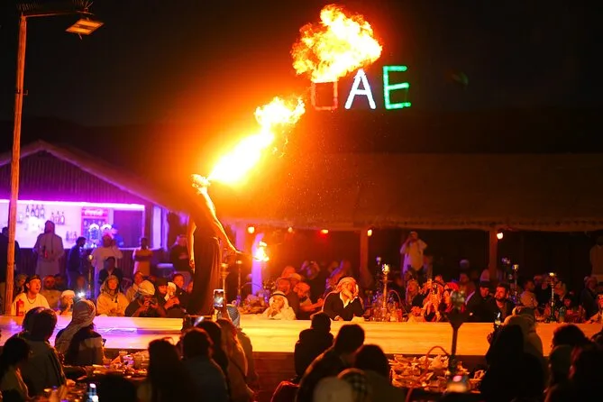 Your evening includes pickup and drop-off by 4x4 vehicle from your hotel or residence in Dubai, entry to a desert camp near Al Madaam’s red dunes, unlimited cold water throughout your stay, welcome sweets and refreshments like shawarma and Arabic coffee on arrival, access to live belly dance and Tanura performances plus fire show entertainment, henna tattoo session (with longer tour options), short camel rides as often as you want within reason, shared shisha pipe if you’re curious to try it out, plus a full barbecue buffet with both vegetarian and non-vegetarian choices before heading back to town after dark.