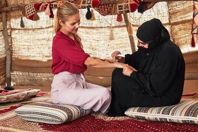 You can try camel riding, henna painting, shisha (hookah), watch live shows like Tanura and belly dancing, plus optional quad biking or photos with a falcon for an extra fee.