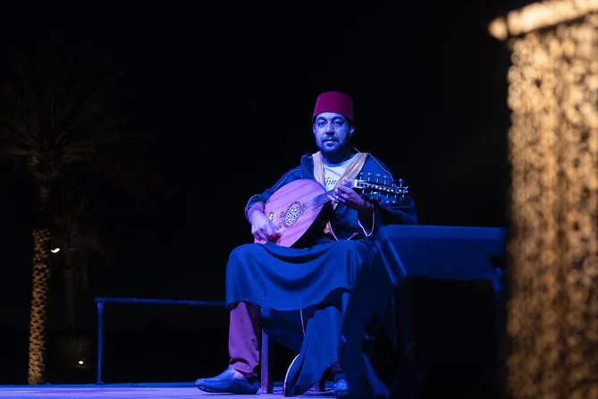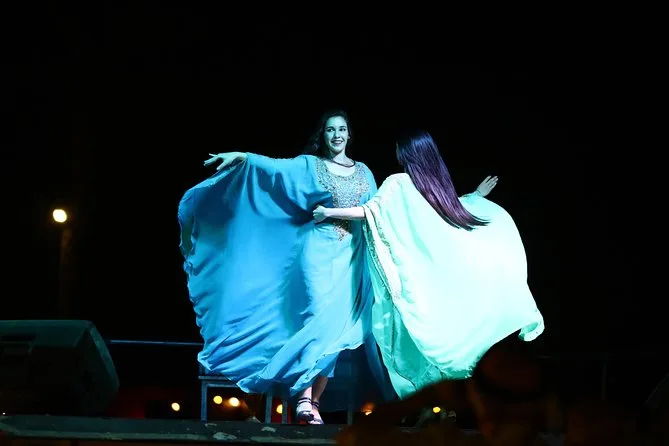 Belly dancing, Tanoura dance, Saidi performance, traditional music and fire shows are featured.
