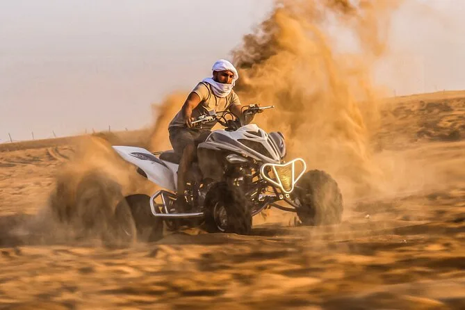 The safari takes place in Lahbab Desert near Dubai, known for its red dunes.
