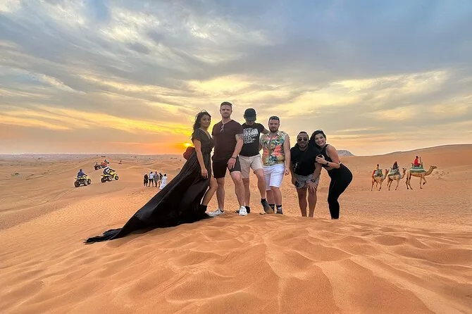 Your day includes private pickup from your hotel or residence in Dubai by 4x4 SUV, guided dune bashing across Lahbab’s red dunes for about 35 minutes, an optional quad bike or dune buggy ride if you want more speed, time for sandboarding down the slopes (and plenty of laughs), a traditional camel ride led by locals who know their stuff, plus a chance to pose with a falcon before heading back to town.