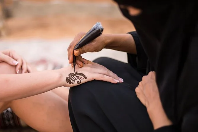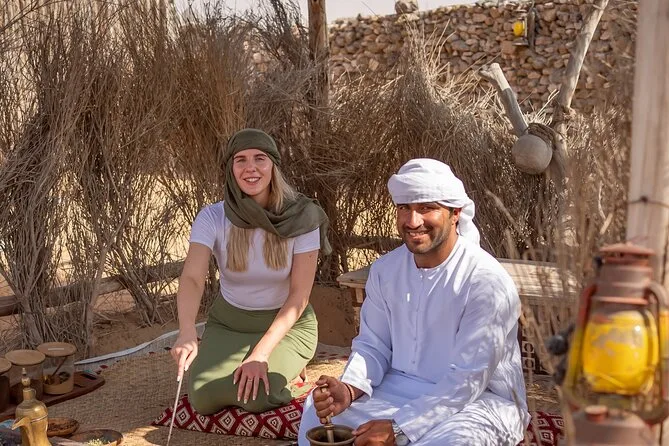Your day includes hotel pickup and drop-off by private vehicle from anywhere in Dubai, entry into Dubai Desert Conservation Reserve with donation support for conservation efforts, use of a vintage Land Rover for your guided nature safari (with headscarf and reusable water bottle as gifts), sunset falcon demonstration, arrival at a torch-lit Bedouin camp where you’ll enjoy Arabic coffee and dates plus live demonstrations like bread-making and camel riding nearby at night. A four-course Emirati dinner is served alongside live music and cultural performances before returning to your hotel later that evening.
