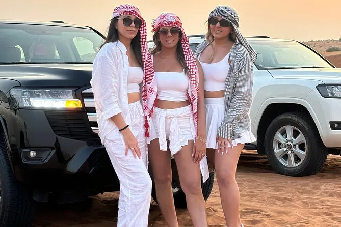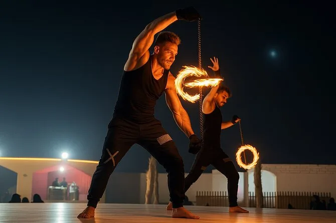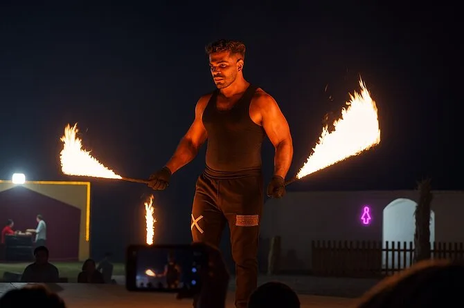 Your day includes pickup from your hotel in Dubai before heading out for 4x4 dune bashing across golden sands with an experienced local guide. You’ll get to try sandboarding down smooth hillsides and enjoy a peaceful camel ride as sunset colors spread across the desert. At camp you’ll be served a flavorful BBQ dinner with both vegetarian and non-vegetarian dishes under lantern light while watching belly dancing, Tanoura spinning and a live fire show. There’s also henna painting by skilled artists, shisha in designated areas and chances to dress up in traditional Arabic outfits for photos before heading back to town.