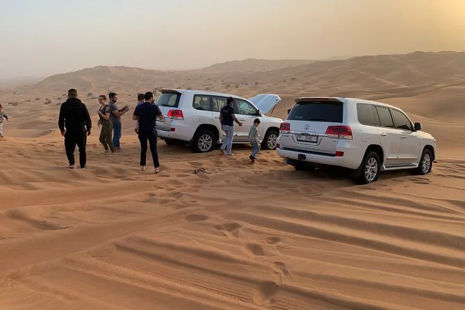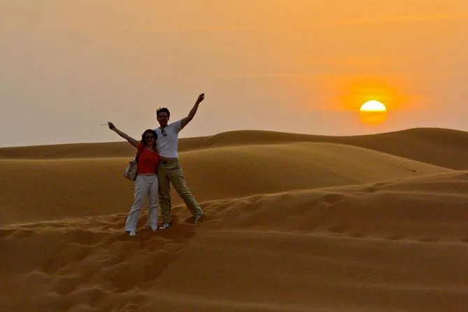 Dune bashing lasts approximately 45 minutes in Lahbab desert during sundown hours.