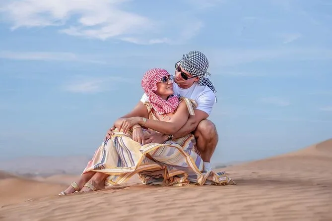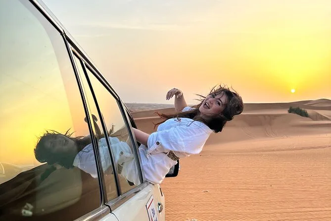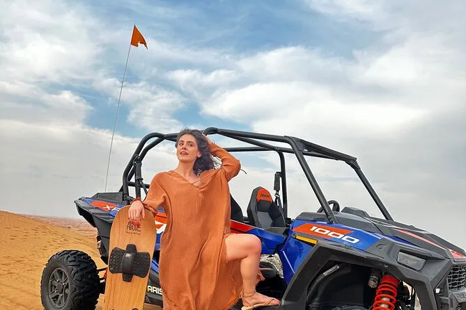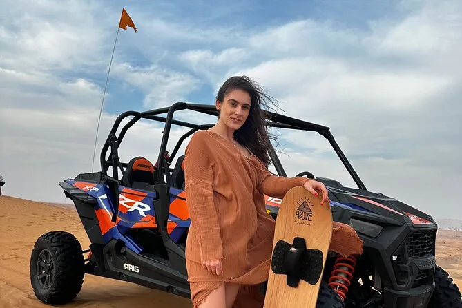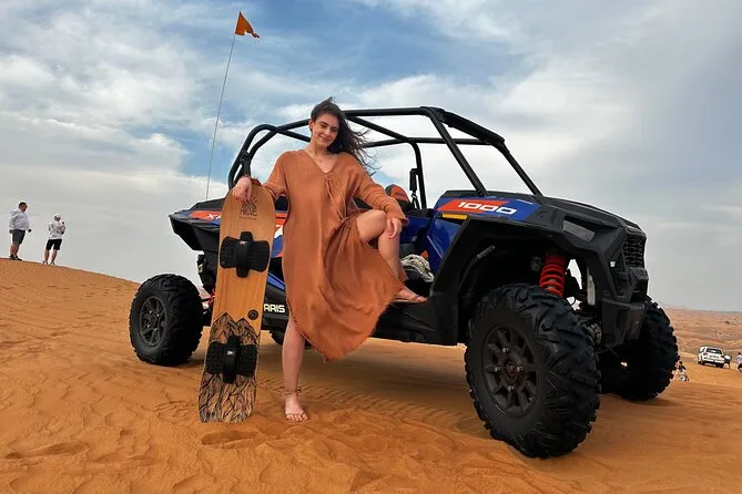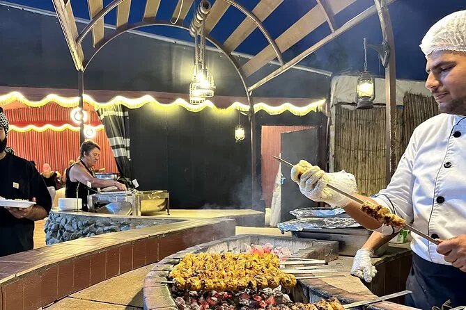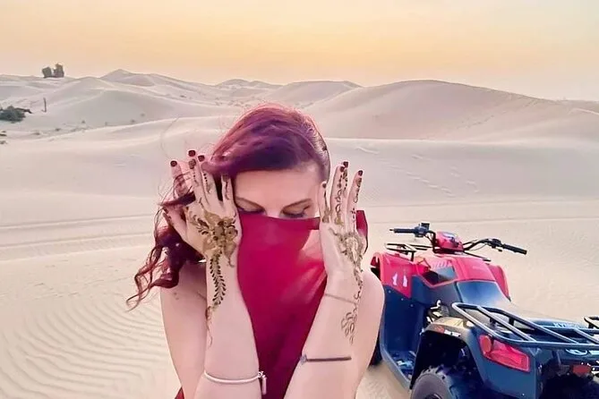 Your day includes pickup and drop-off from your hotel or chosen location in Dubai, 30 minutes of quad biking across red dunes, sandboarding sessions if you’re up for it, a gentle camel ride (with plenty of time for photos), small henna tattoos at camp, VIP seating around low tables for a fresh live BBQ buffet dinner with local entertainment before heading back after dark.