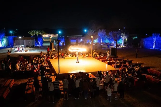 Your day includes hotel pickup and drop-off by air-conditioned vehicle from anywhere in Dubai, all entry fees and taxes covered upfront, a short camel ride through the sand dunes, an open buffet barbecue dinner at camp with plenty of choices (including salads and desserts), plus live entertainment featuring belly dance shows, tanoura spinning performances, fire shows—and even small henna tattoos if you want one before heading back under those crazy-bright stars.