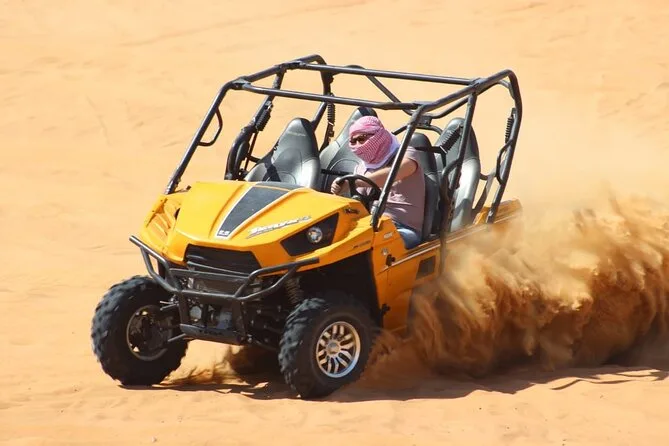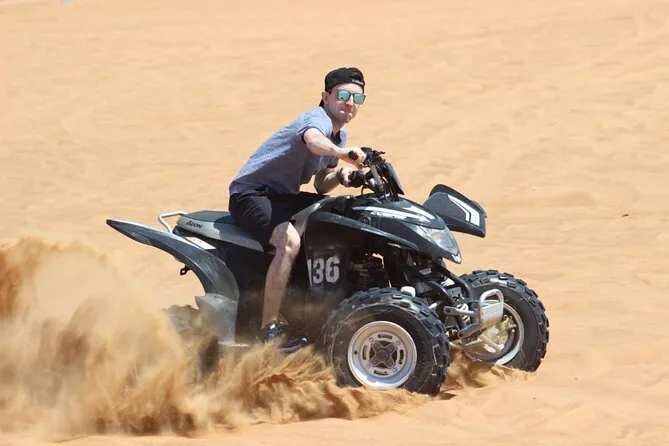 You’ll do dune bashing, sand boarding, camel rides, henna painting, quad biking (optional), falcon photography, horse riding, and enjoy live shows.