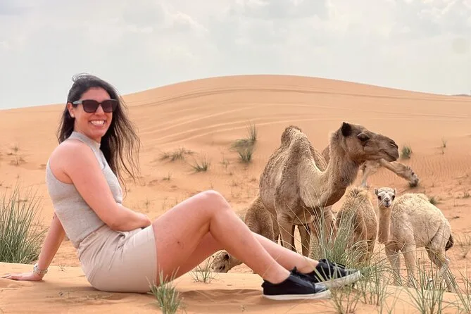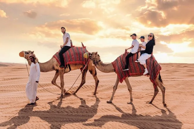 You’ll experience dune bashing, sandboarding, camel rides, live shows (belly dance, Tanoura dance, fire show), shisha smoking, henna tattooing, and a BBQ dinner.