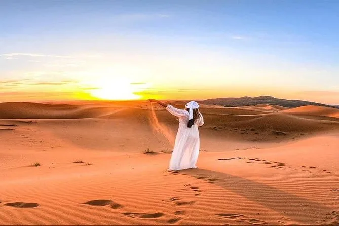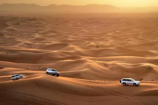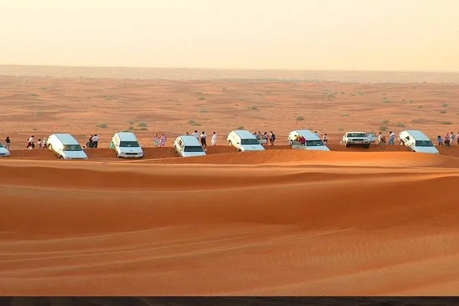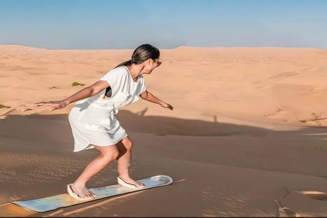 Dune bashing on red sand dunes, camel ride, sandboarding, live entertainment shows (belly dance, Tanura dance, fire show), henna painting and a BBQ dinner.