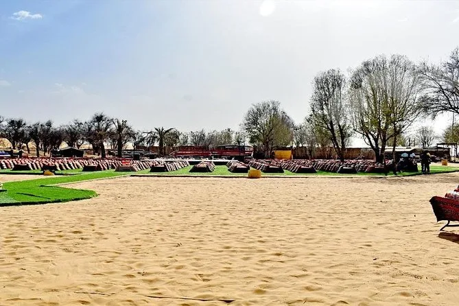 Your day includes 4x4 hotel pickup and drop-off from Dubai or Sharjah, dune bashing on red sand dunes with an experienced driver, a camel ride at sunset plus time to try sandboarding. At camp you’ll have unlimited refreshments like coffee, tea and soft drinks along with a full BBQ buffet dinner (veg & non-veg), live entertainment shows including belly dance and fire performance, henna painting opportunities and even a chance to dress up in Arabic traditional costume for photos before heading back after dark.