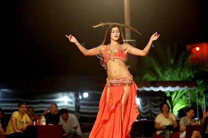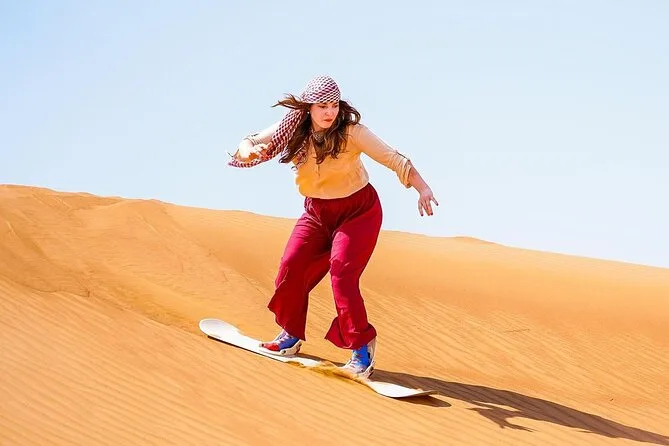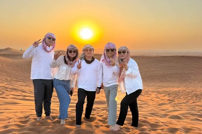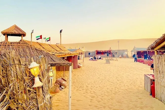 The tour includes camel riding, sandboarding, henna painting, Arabic dress photography, falcon photos, shisha smoking (at camp), live Tanura & belly dance shows (except during Ramadan).