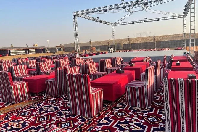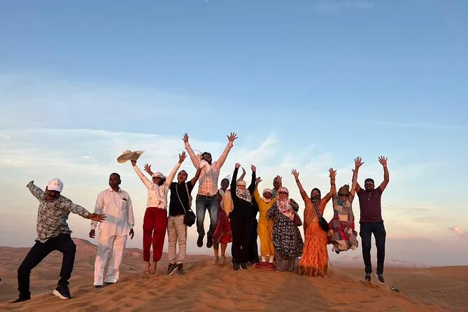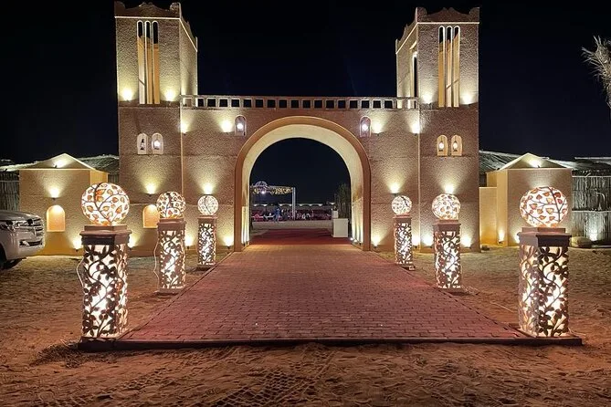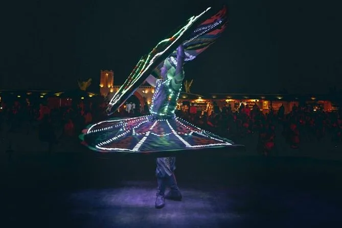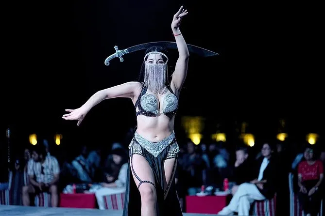 Your evening includes private hotel pickup in a 4x4 vehicle from Dubai or Sharjah, exclusive dune bashing led by an expert guide across red dunes, an optional stop for quad biking or dune buggy rides (extra cost), a peaceful camel ride with photo opportunities at sunset, sandboarding sessions on soft slopes, traditional Arabic coffee and falafel on arrival at the Bedouin-style camp with VIP seating for your group. Enjoy unlimited soft drinks plus tea and coffee throughout the night while watching eight different live performances before relaxing over a generous BBQ buffet dinner with plenty of vegetarian options before your driver takes you back to your hotel.