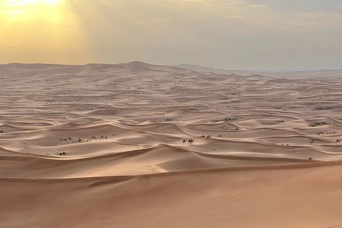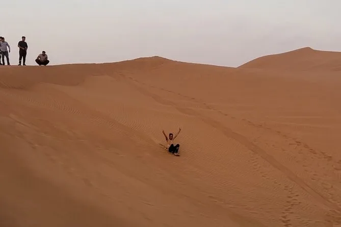 The tour includes dune bashing in a 4x4 vehicle, sandboarding on the dunes, a short camel ride, and photo stops.