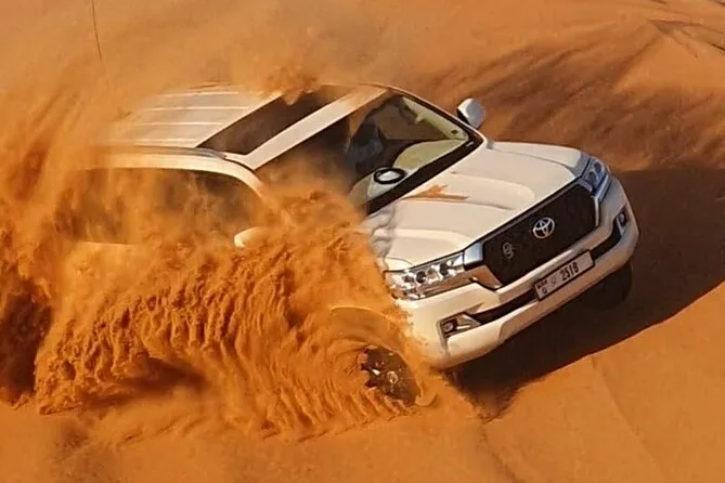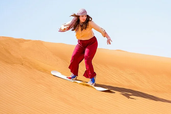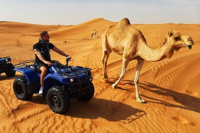 You’ll feel every part of Dubai’s desert on this tour: quad biking across red dunes with a local guide, sandboarding breaks with plenty of laughs, slow camel rides as evening falls, and finally unwinding at Al Aweer Camp with barbecue dinner and live entertainment under desert stars.
