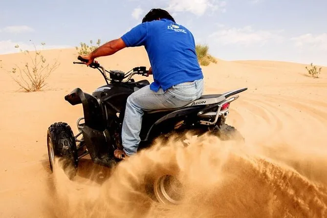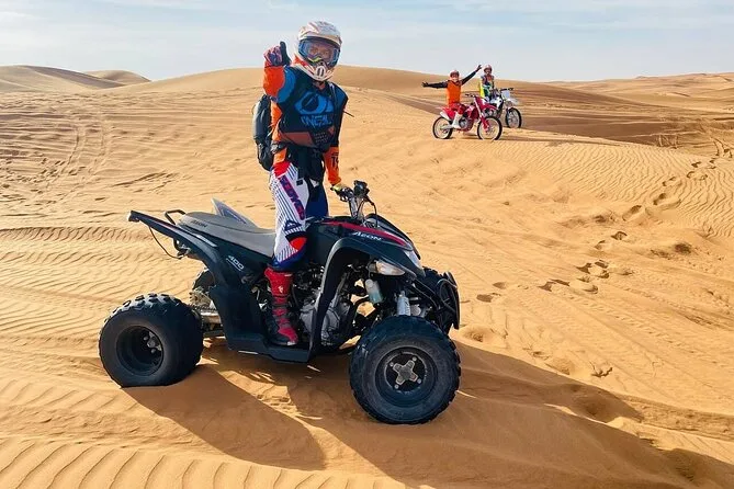 Your day includes hotel or home pickup from anywhere in Dubai or Sharjah before heading into Lahbab Desert for sixty minutes of open-desert quad biking (with ID required), plus dune bashing in a Land Cruiser, sandboarding down high dunes if you’re up for it, short camel rides guided by locals offering gahwa and dates along the way, unlimited soft drinks and juices throughout camp time, henna painting for ladies and kids, live belly dancing and fire shows after sunset—and finally a full BBQ buffet dinner with both veg and non-veg options before your return drop-off in the evening.