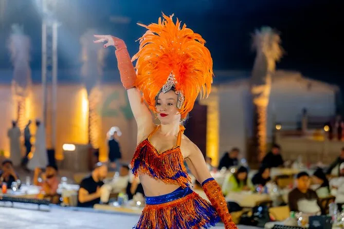 Dune bashing in red dunes, optional quad biking or buggy rides, sandboarding, camel ride, henna painting, buffet BBQ dinner, and 9 live entertainment shows.
