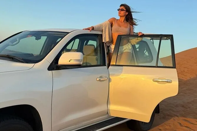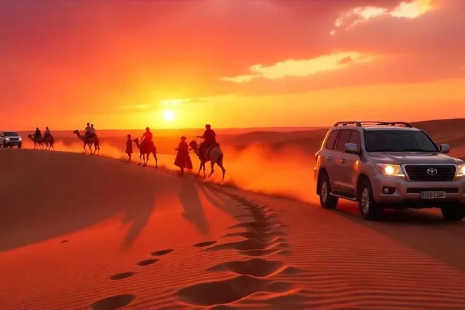 Dune bashing in Lehbab Desert, sunset photography, optional ATV/buggy rides, camel experience, sandboarding, henna tattoos, dinner with live shows.