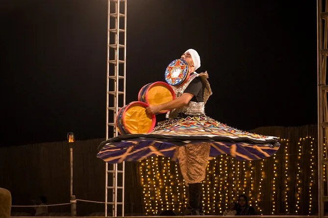The evening part slowed everything down. At camp there were lanterns flickering and someone making sweet mint tea behind a low table. There was henna painting (I smudged mine almost immediately), short camel rides (the camels looked unimpressed by us), and people drifting between cushions. The food smelled smoky — grilled lamb, spiced rice, something garlicky — and I ate too much bread because it was warm from the fire. The Tanoura dancer spun so long I got dizzy just watching him. Later, under stars that looked fake-bright, there was this hush before the fire show started — you know that moment when everyone just stops talking for a second? Still think about that.