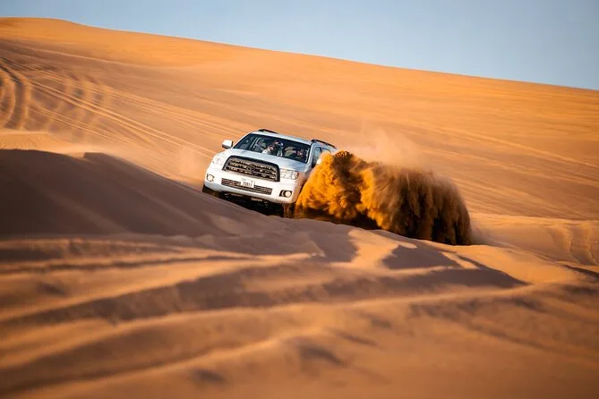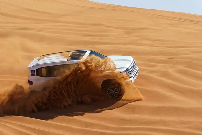 Your evening includes comfortable hotel pickup and drop-off in an air-conditioned vehicle, a 25-minute quad bike ride over Lahbab’s red dunes, thrilling dune bashing with experienced drivers, sandboarding fun if you’re up for it, a short camel ride at camp, henna art sessions if you want to try them out, plus unlimited soft drinks and a full BBQ dinner (vegetarian options too) before heading back to your hotel when night falls.