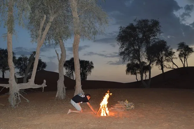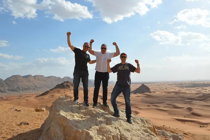 Your day includes hotel pickup and drop-off anywhere in Dubai, bottled water for everyone onboard (you’ll want it), all fuel costs covered so you can focus on driving not meters ticking up, use of a fully-equipped air-conditioned Jeep Wrangler with safety gear supplied — plus expert guidance via walkie-talkie throughout and free pro photos snapped while you bash those dunes or pause at Fossil Rock for sunset views before heading back dusty but happy.