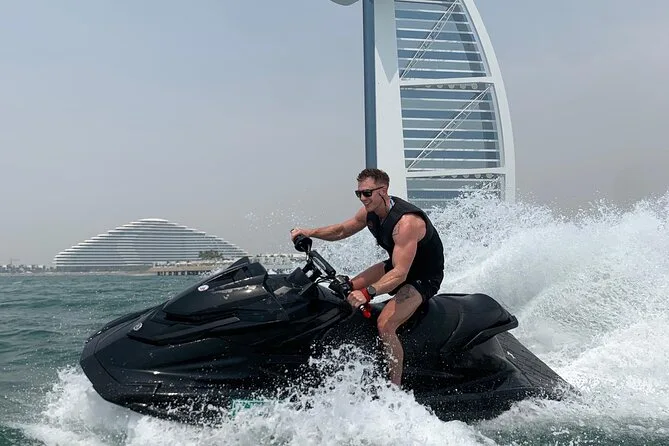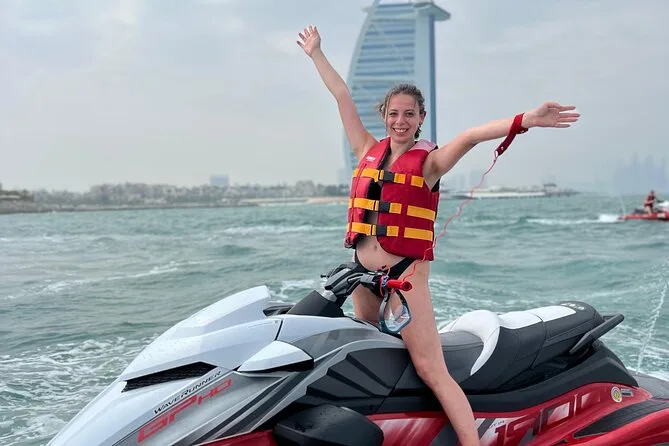 Your session includes use of a Yamaha 1800cc jet ski for two people with all safety gear—mask or glasses and life jacket—plus free digital photos taken by your guide at Burj Al Arab. At the station you’ll have access to showers, changing cabins, lockers for valuables, coffee machine and drinking water; towels and waterproof pouches are available for purchase if needed before you head out on the water.
