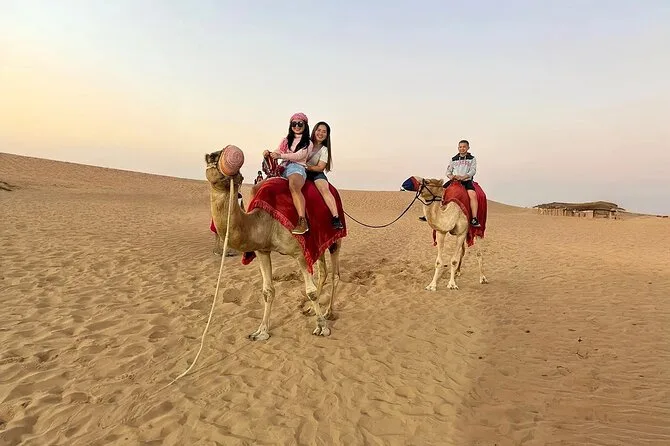 After that rush, we swapped wheels for hooves — camels are taller than they look, by the way. The camel handler just called him “Majnoon” and winked. Sitting up there as the sun started to dip behind the dunes made everything go kind of quiet for a second. There was this orange-pink light on the sand that didn’t look real. Then came dune bashing — our guide drove like he was in some desert rally; I grabbed the seat more than once (don’t wear white if you can help it). Sandboarding was trickier than it looks on Instagram — I fell twice and got sand everywhere but managed one good slide that felt like flying for half a second.