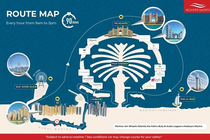 You’ll see Dubai Marina, Palm Jumeirah, Atlantis The Palm, Burj Al Arab, Ain Dubai Ferris wheel, and more.