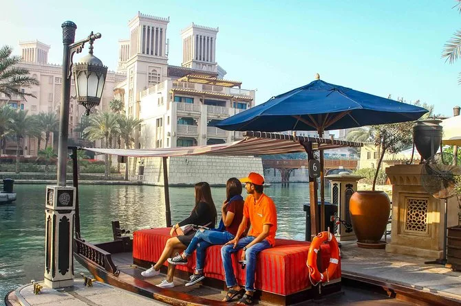 You cross Dubai Creek by traditional wooden boat (abra), seeing both old houses and modern towers along the water.