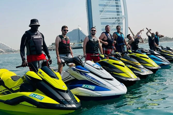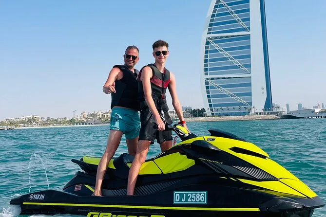 Your tour includes use of a brand new two-seater jetski (passenger rides free), all necessary safety equipment fitted before departure, bottled drinking water for each guest—and of course guidance from a local instructor who keeps an eye on everyone as you ride past Palm Jumeirah, Atlantis, Burj Al Arab and more before heading back to base.